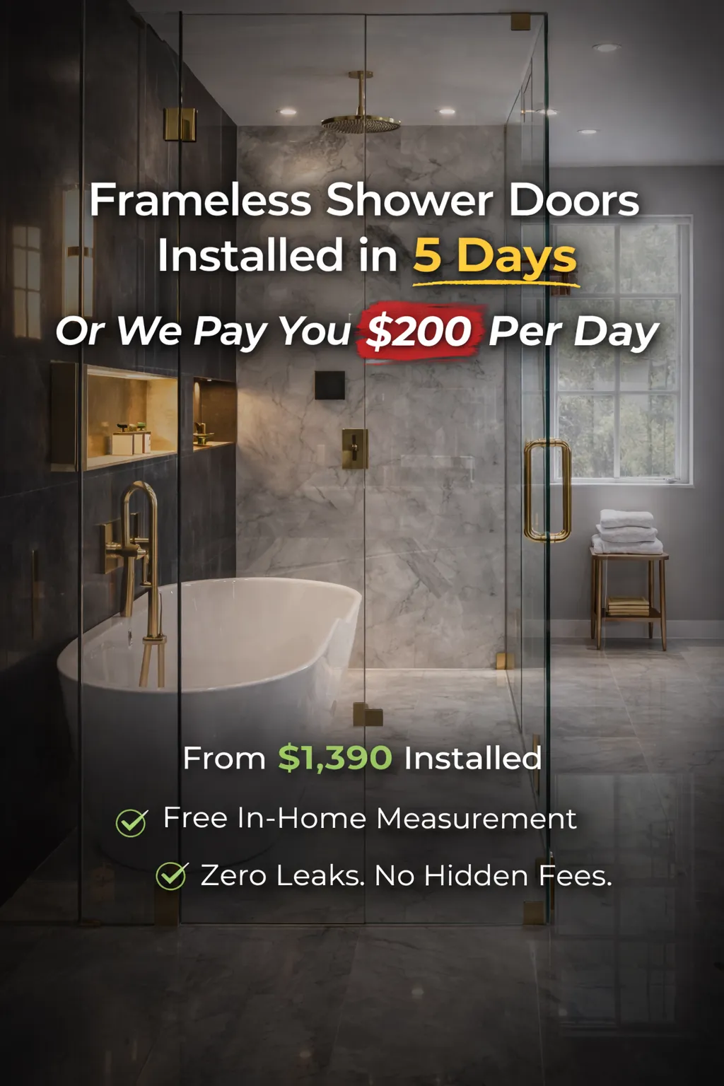 Our pricing includes professional in-home measurement, custom glass fabrication, hardware, and installation. There are no hidden fees and no surprise charges.